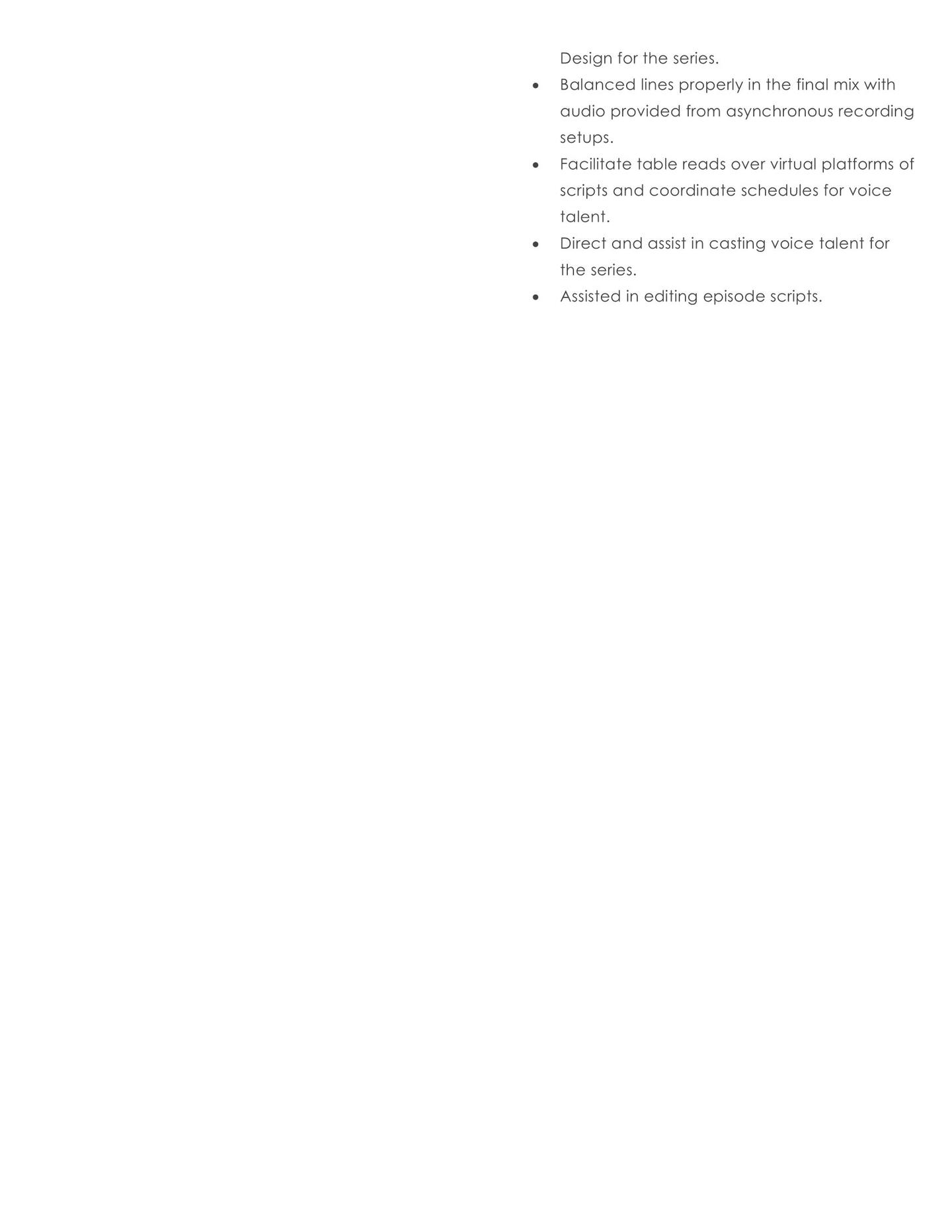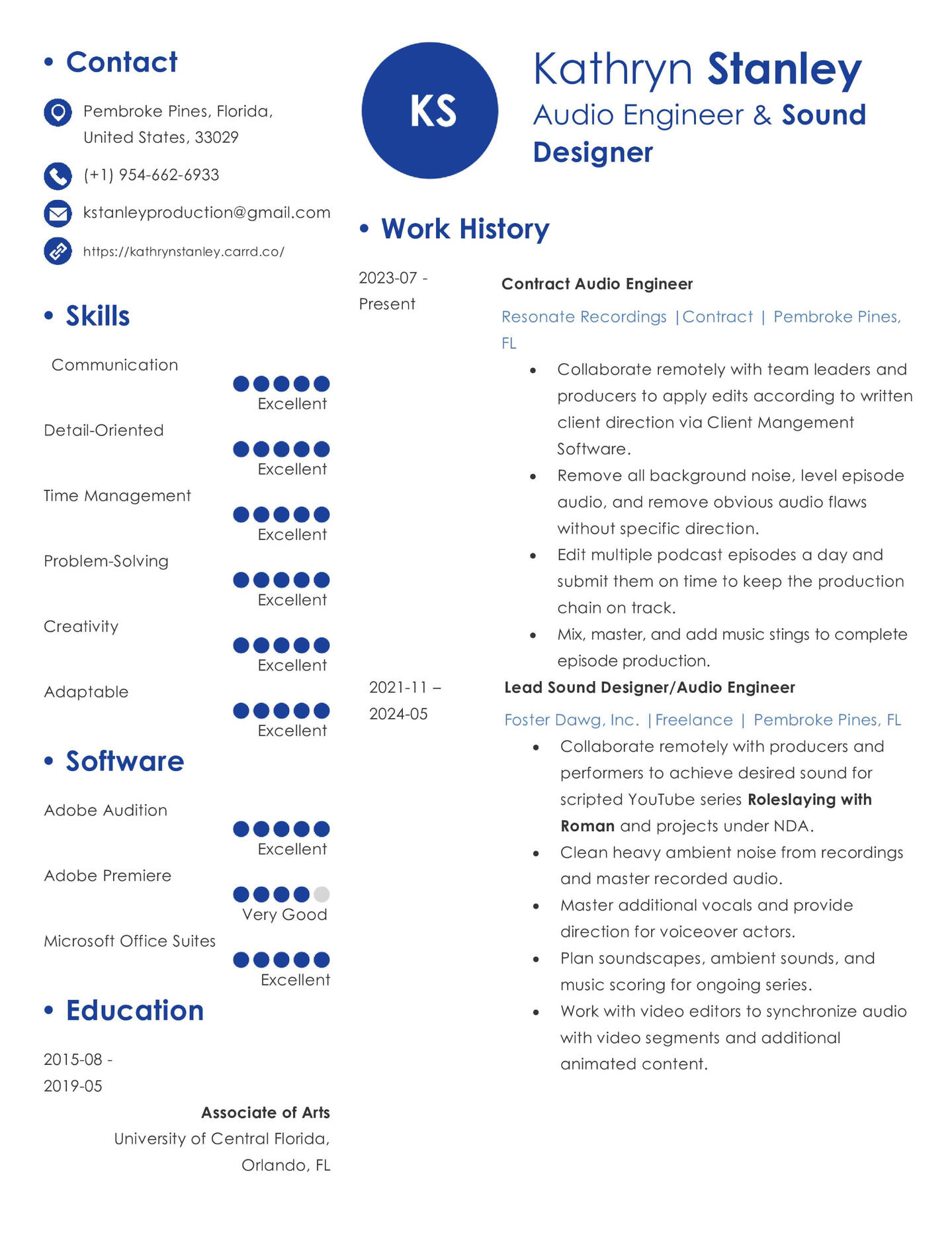 Kathryn is proficient in dialogue editing and cleanup, take selection and splicing, sound design, and music selection for a wide range of audio dramas.